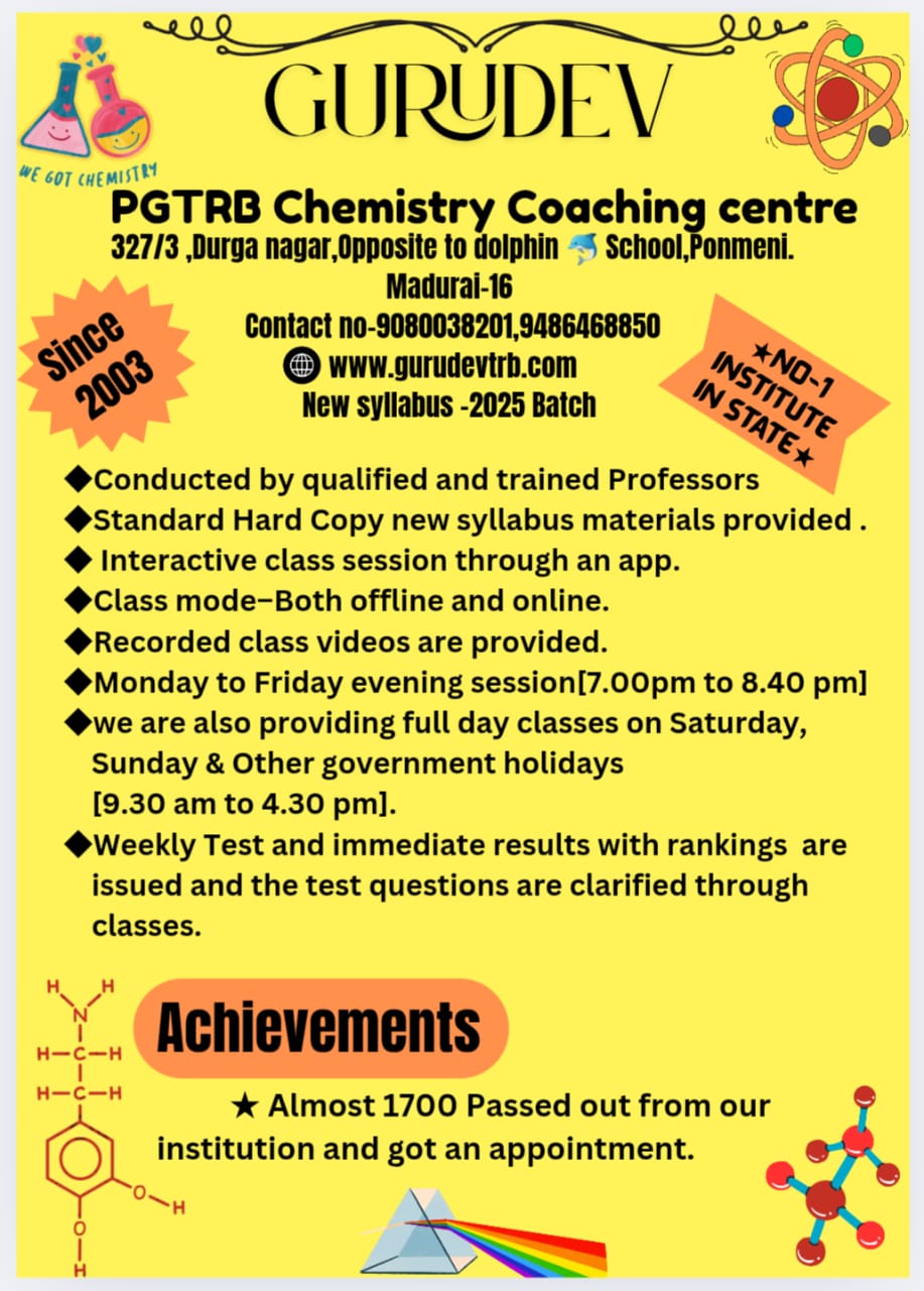 EXCELLENT Based on 46 reviews ANAND GAJA2023-04-19Trustindex verifies that the original source of the review is Google. one of the best coaching centre in Tamilnadu. especially in chemistry. I learn chemistry with new way. Veera Sekaran2023-04-18Trustindex verifies that the original source of the review is Google. Most excellent program in PGTRB CHEMISTRY Nangai Gk2023-04-18Trustindex verifies that the original source of the review is Google. Good experience in my study's.we learn from basics to higher level and ask any doubts as friend ,we get clarity immediately. Sir I wish to you get success to this way, teach lot of teacher will get better life. Thank you sir. sutha subhash2023-04-17Trustindex verifies that the original source of the review is Google. Having 20 yrs of experience and use updated technologies for teaching.short cut tricks helps to score good marks in competitive exams. Recorded videos help us to clarify the doubts in future.thank u for ur effort sir lavanya s2023-04-17Trustindex verifies that the original source of the review is Google. Clear explanation of offline & online classes & recording videos also available anytime. Usha Rahini2023-04-17Trustindex verifies that the original source of the review is Google. teaching method is easy to understand. an barasan2023-04-17Trustindex verifies that the original source of the review is Google. Discuss oriented class, legible writting,weekly test, questions discussion, good audiable voice... Narayanan Vijendran2023-04-17Trustindex verifies that the original source of the review is Google. Very useful for TRB Coaching, Online classes are very Good